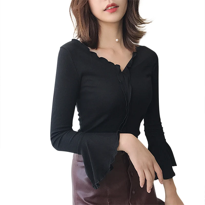 » Clearance Automne femme Sexy T-shirt volants col en V en mousseline de soie T-shirt femmes à manches longues