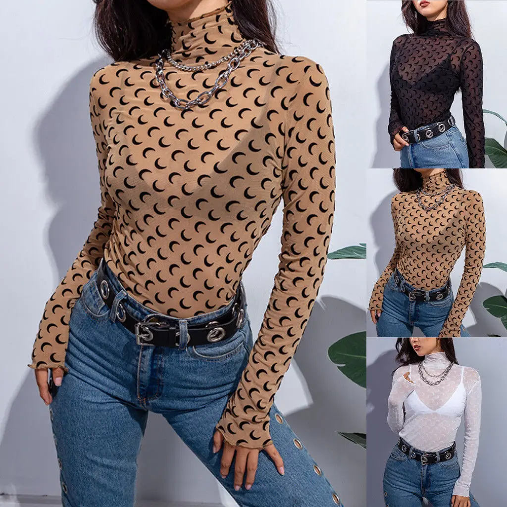 » Coupon 2019 Sexy femmes col haut Transparent maille chemises Top dame filles d'été à manches longues Blous