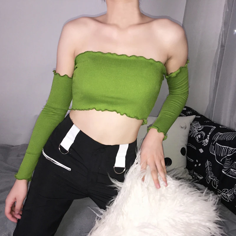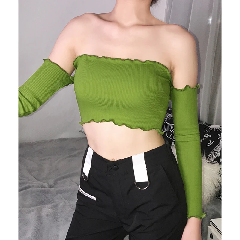 On sale Sexy femmes T-Shirt haut court automne hors épaule à manches longues hauts dames couleur unie Slash