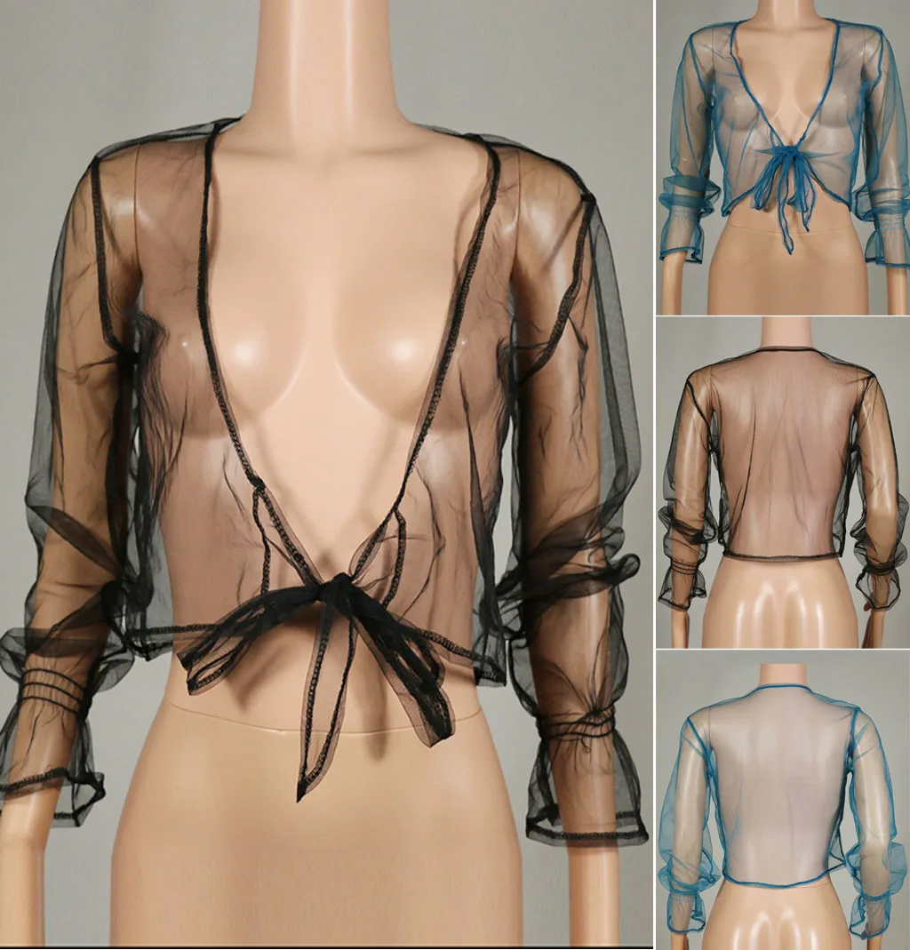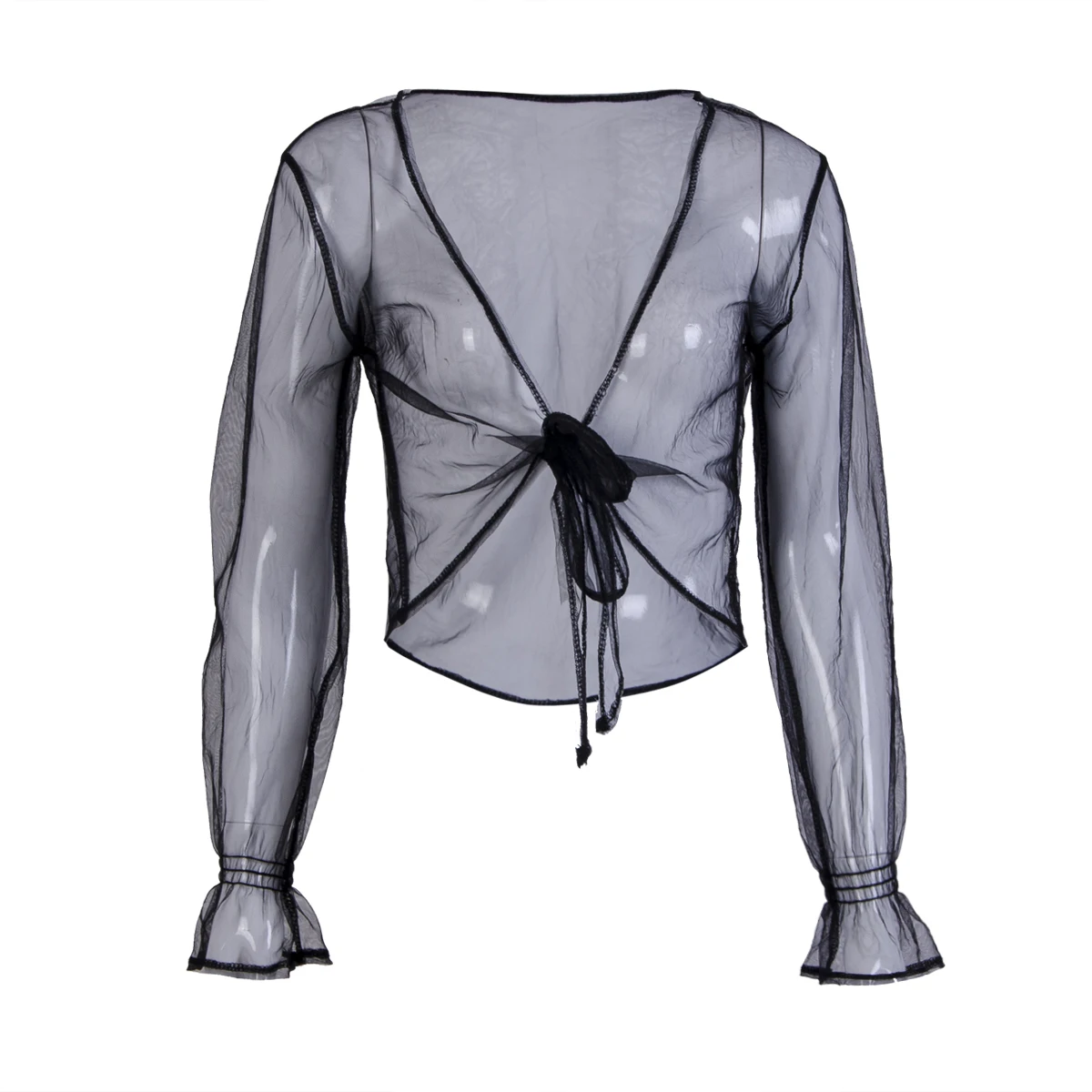 Premium Femmes filles maille pure haut court à manches longues chemise transparente Blouse t-shirt hauts
